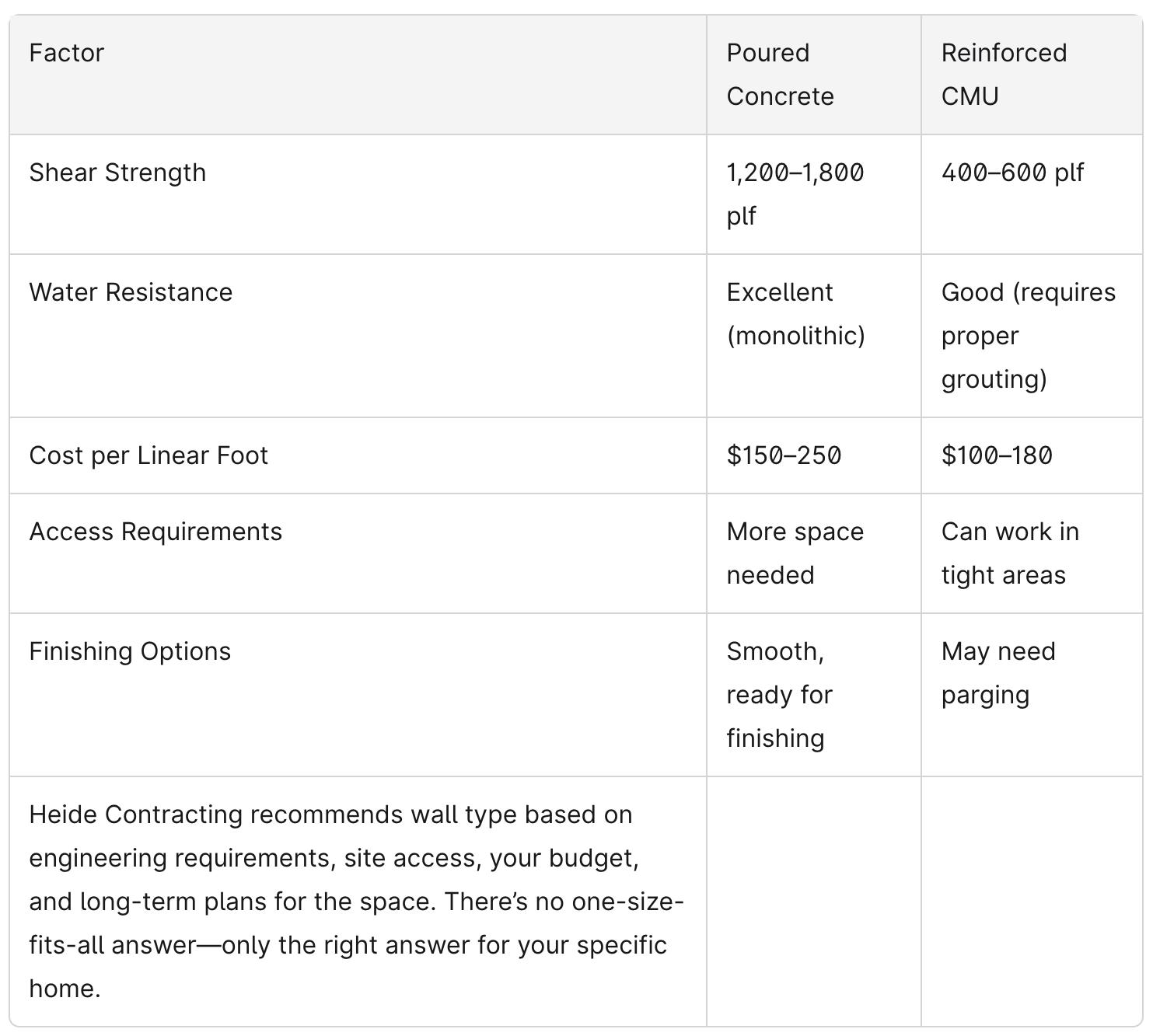 When reconstructing a foundation wall, two primary structural options exist: cast-in-place concrete walls and reinforced concrete masonry unit (CMU) block walls. Both can deliver excellent long-term performance when properly engineered and constructed.